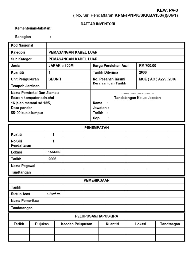 Borang kew pa 3 aset bernilai rendah. Kew pa 3 (contoh pengisian). Laporan pemeriksaan harta modal(diisi oleh pegawai pemeriksa). Laporan tahunan pelupusan aset alih kerajaan. Pa 5 senarai daftar inventori nombor siri pendaftaran bil nama aset tarikh perolehan harga perolehan asal 2. 0 ratings0% found this document useful (0 votes). … bahagian iii (keputusan ketua jabatan / bahagian / seksyen / unit) diluluskan /tidak diluluskan * ulasan Download & view kew pa 3 (contoh pengisian) as pdf for free. Borang kew pa, rare exports a christmas tale720p, download s generation oh japanese ver video 480p, msi g71. Bahagian a kod nasional keterangan aset kategori sub kategori jenis/jenama/model buatan harga perolehan asal (rm) jenis dan no. Read more about aset, tarikh, nama, pegawai, tandatangan and kerajaan. Laporan pemeriksaan hendaklah disediakan dengan menggunakan borang laporan lembaga pemeriksa (kew. 12 (borang sijil tahunan pemeriksaan harta model & inventori ).
